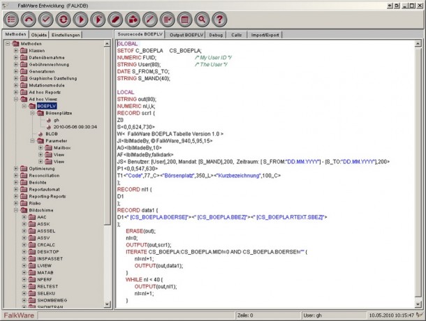 Der Entwicklungsarbeitsplatz zeigt in der Baumstruktur unter Methoden die zu dem aktuellen Benutzer gehörenden Module (Falk Scripts) die Kategorie und Parameter dazu. Unter der Kartei werden vordefinierte Elemente zur Auswahl angeboten, welche oft Verwendung finden. Im weissen Fenster daneben wird das Script angezeigt, welches aktuell in Bearbeitung ist.