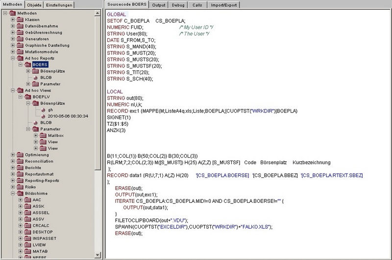 Im obersten Teil von GLOBAL bis LOCAL befinden sich Daten welche auch anderen Scripts zugänglich sind (GLOBAL) ein spezieller davon ist SETOF C_BOEPLA CS_BOEPLA, dies ist der Container, welcher die Klassen aller Börsenplätze enthält. Danach folgt der Bereich der Script privaten Daten. Hier finden wir z.B. RECORDs, dies sind Datencontainer, deren Inhalt jeiweils für Werte welche sich innerahl [ ] befinden bei der Auswertung dynamisch angepasst wird.